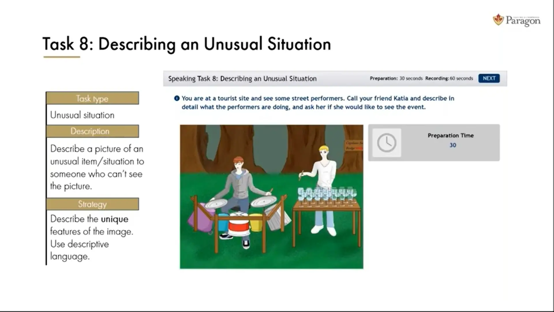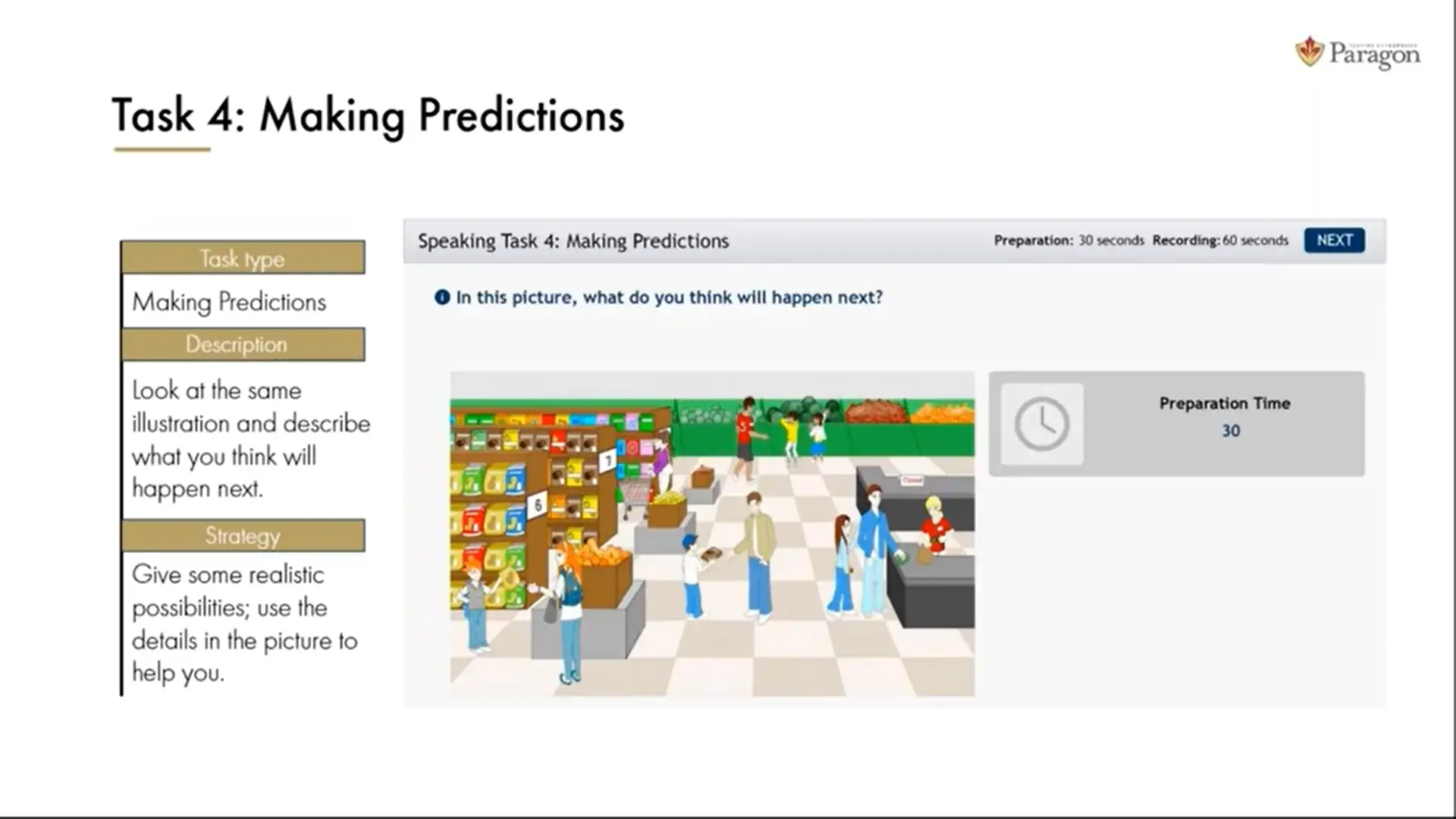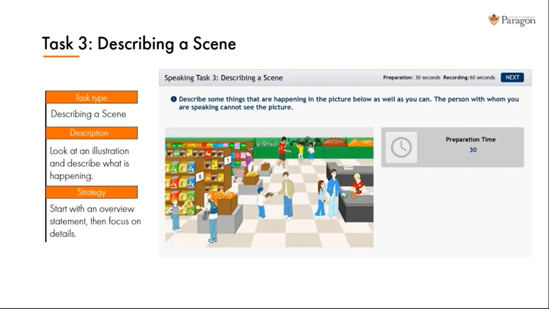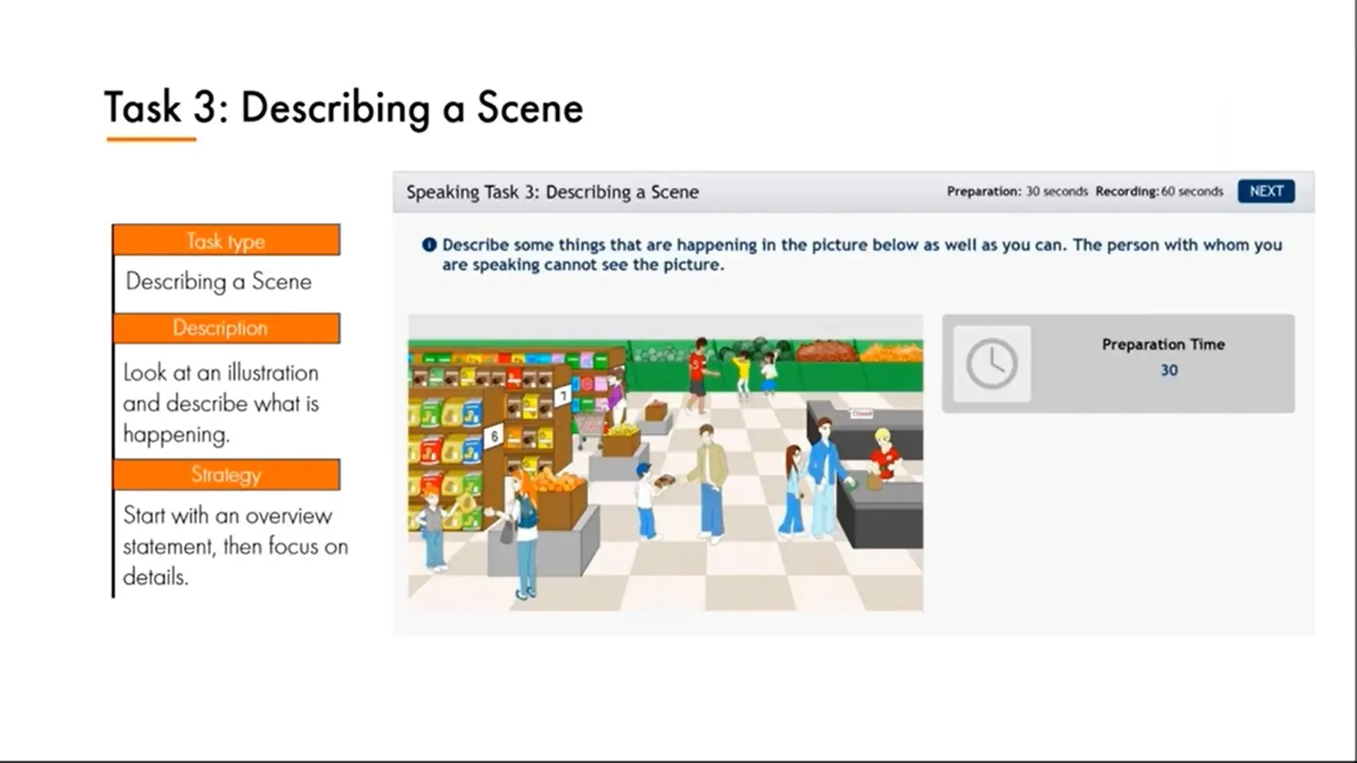 در این تسک، شما 60 ثانیه زمان دارید تا تصویری که به شما داده میشود را توصیف کنید.