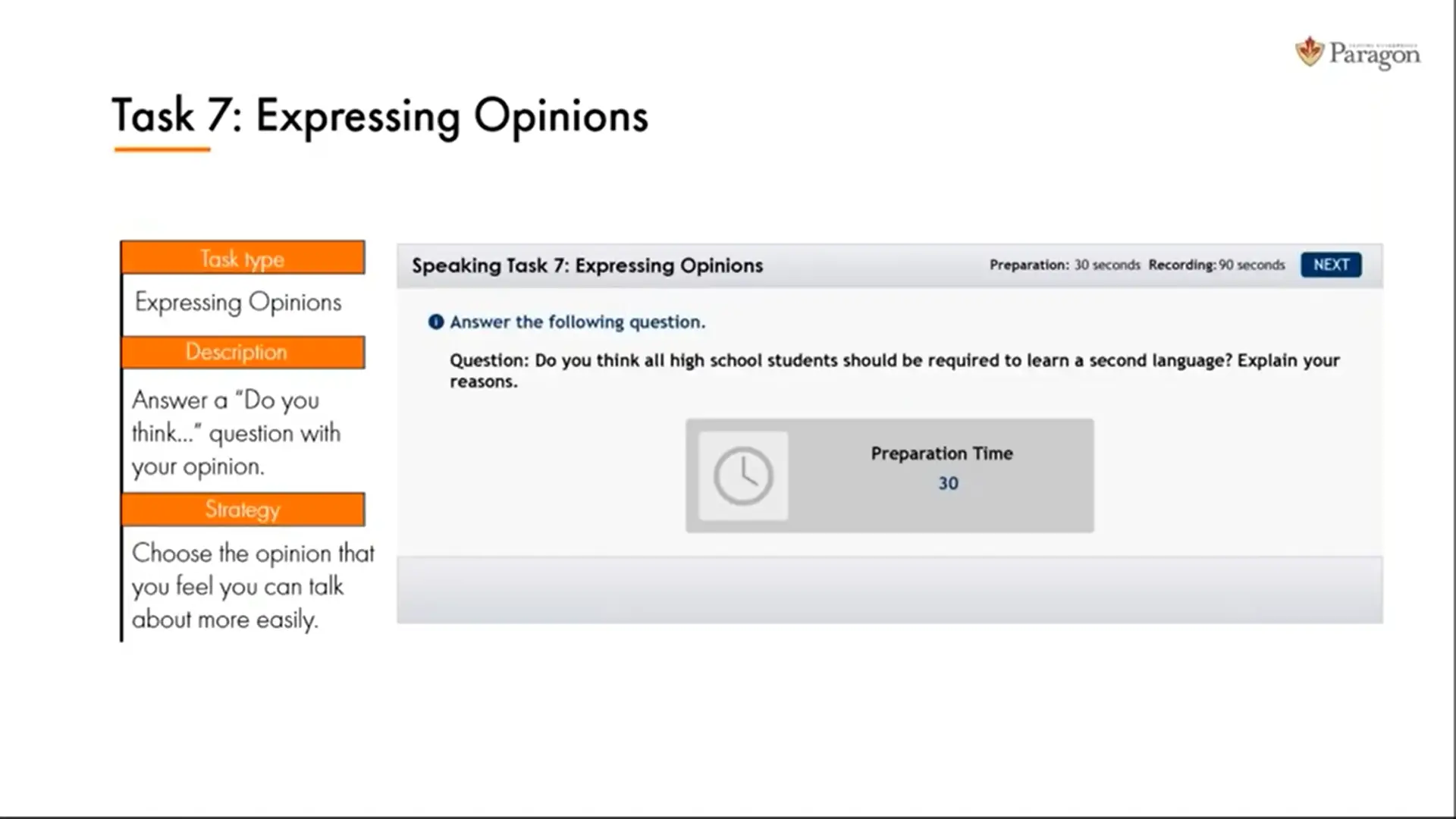 در این تسک، شما 90 ثانیه زمان دارید تا نظر خود را در مورد موضوعی خاص بیان کنید و دلایل آن را شرح دهید.