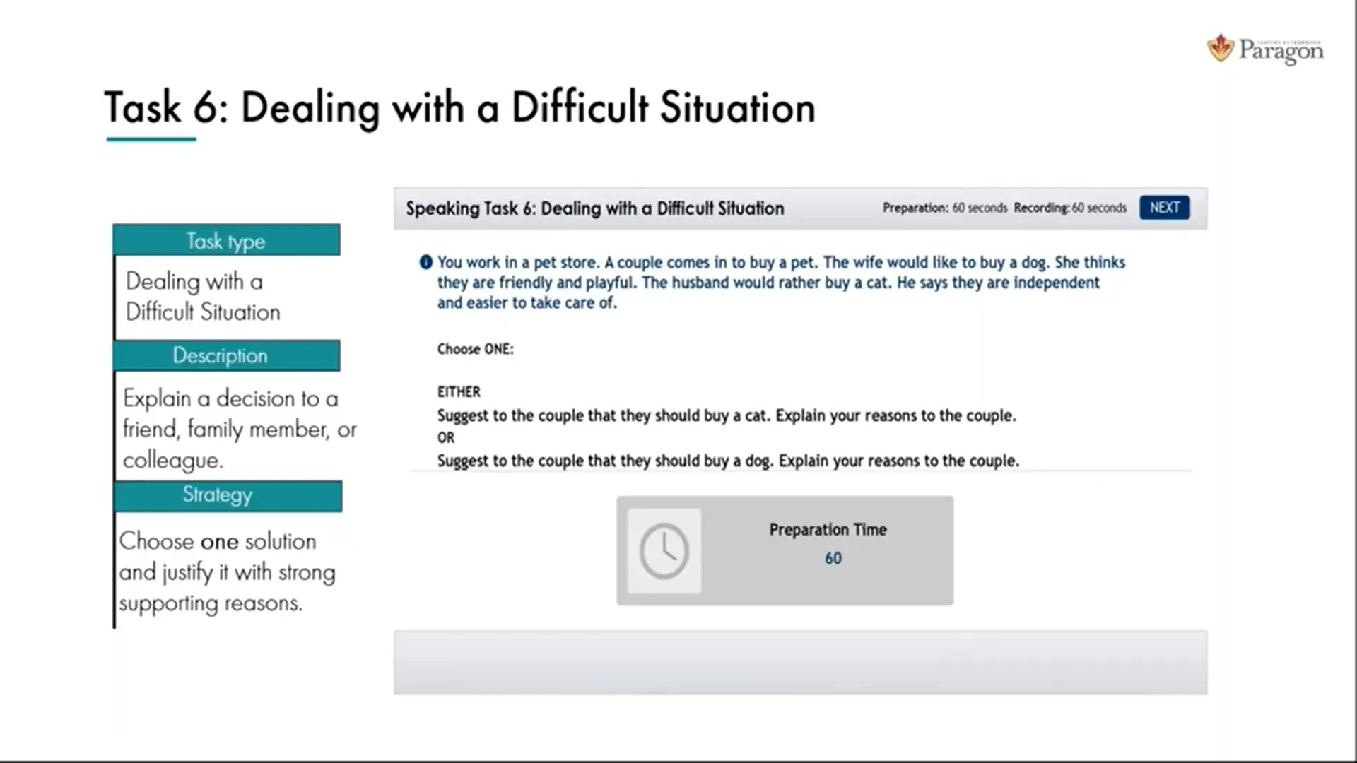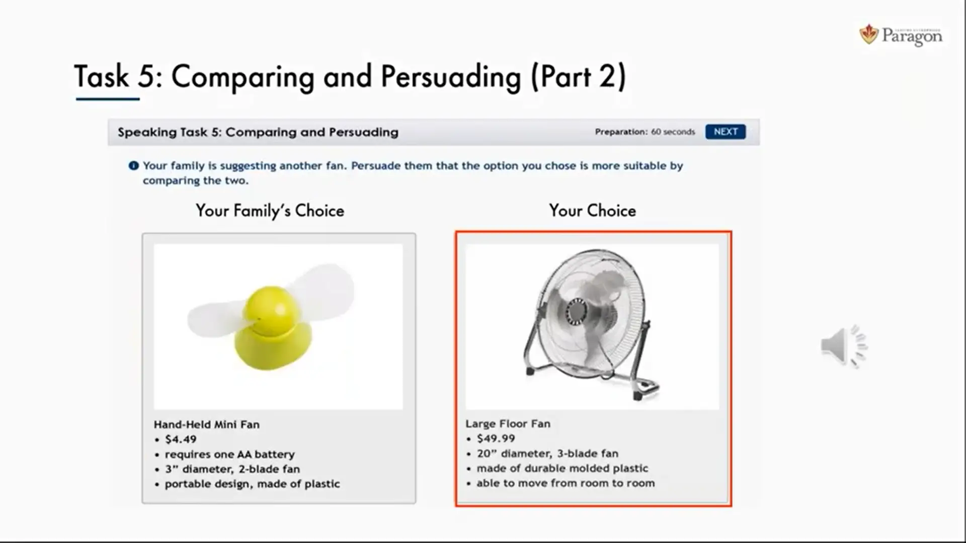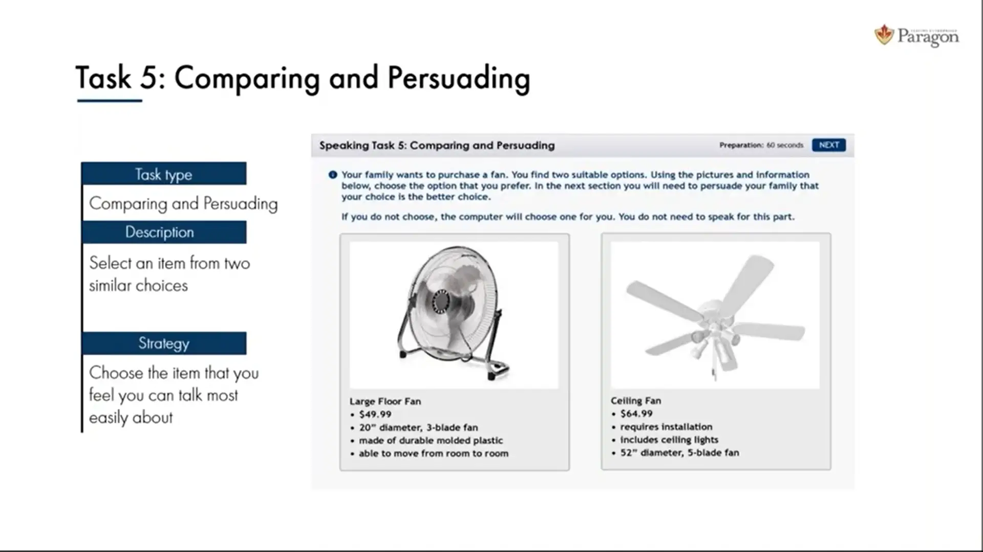 در این تسک شما 120 ثانیه فرصت فکر کردن و 60 ثانیه فرصت صحبت کردن دارید. بخش اول این تسک شما 60 ثانیه فرصت دارید تا از بین گزینه ها یکی را انتخاب کنید. در بخش دوم مجدد 60 ثانیه فرصت دارید تا انتخاب خود را با انتخاب سوم مقایسه کنید. در بخش سوم، شما 60 ثانیه زمان دارید تا صحبت کنید و دلایل انتخاب خود را توجیه کنید.