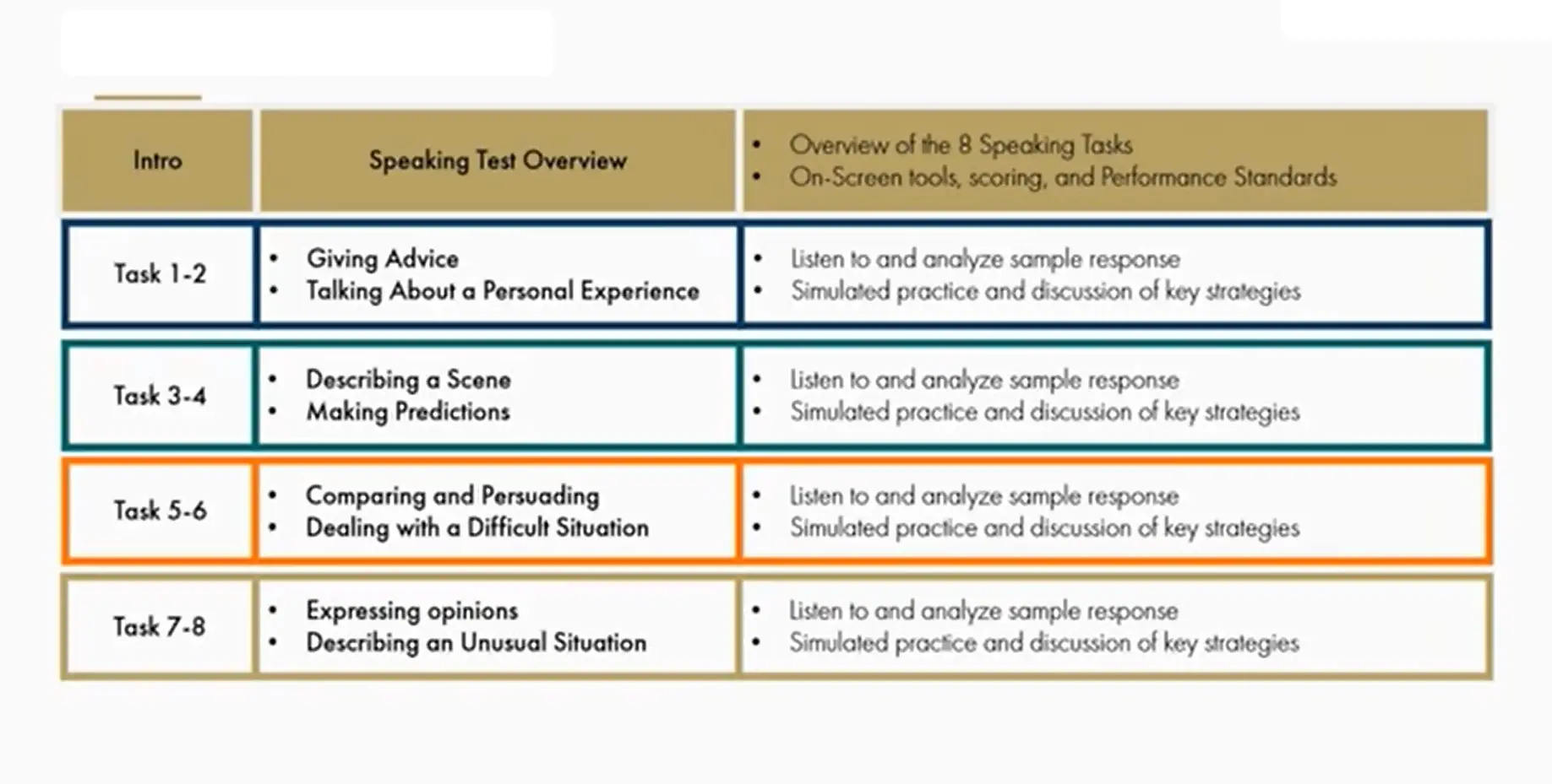 به طور کلی بخش اسپیکینگ از 8 تسک + 1 تسک تمرینی بدون نمره تشکیل شده است که باید به صورت پشت سر هم پاسخ داده شوند. طبق توضیحاتی که در ادامه ارایه میشود در بعضی از تسکها 60 ثانیه و در بعضی 90 ثانیه به متقاضی زمان داده میشود تا صحبت کند و فایل صوتی خود را ضبط کند.