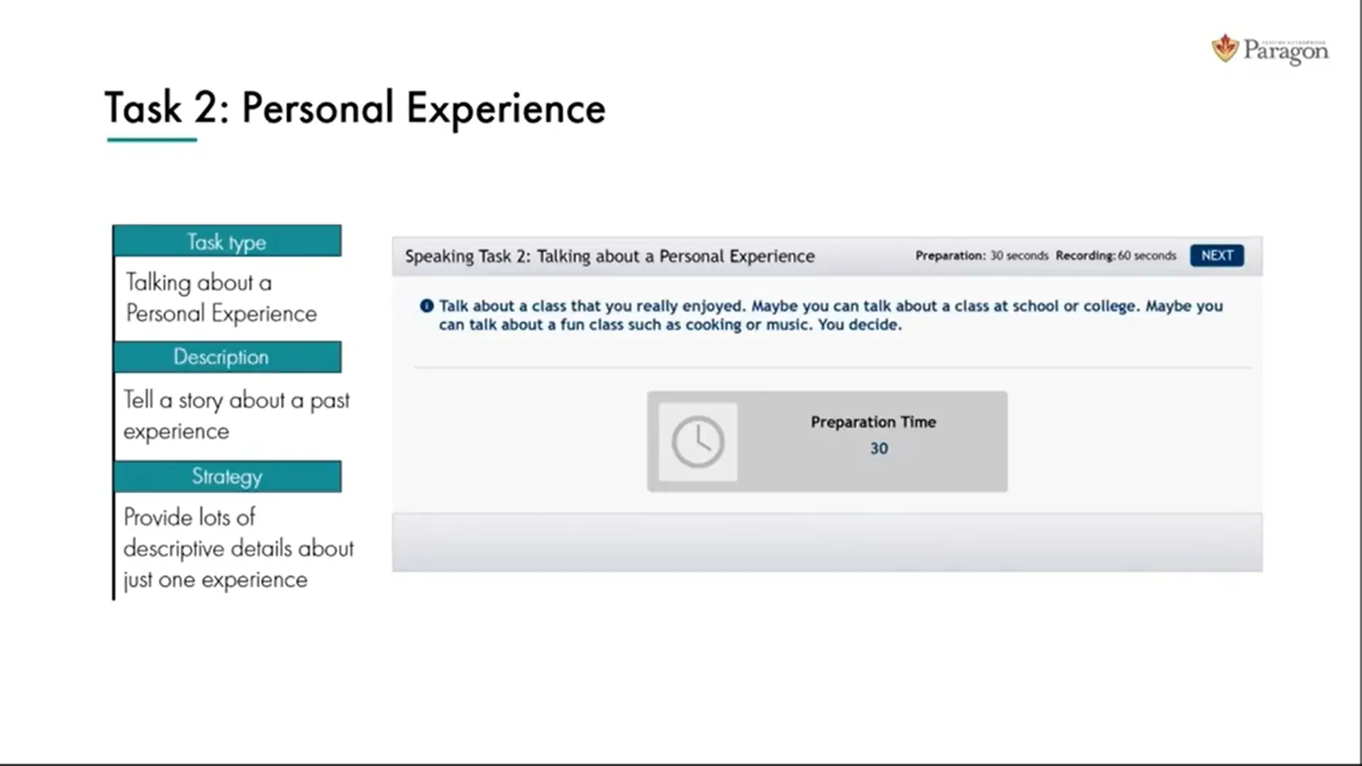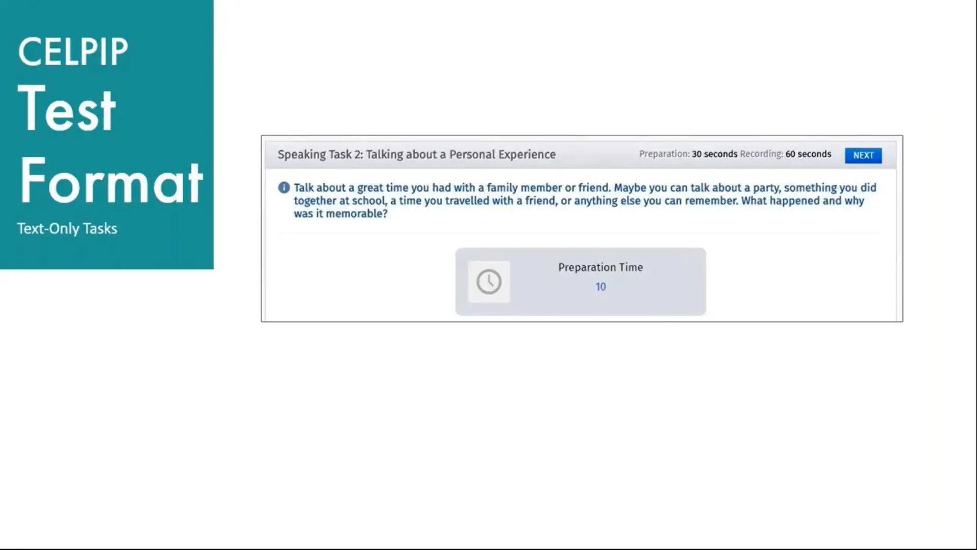 در این تسک، شما 60 ثانیه زمان دارید تا یک تجربه شخصی را که مربوط به گذشته است، توضیح دهید.