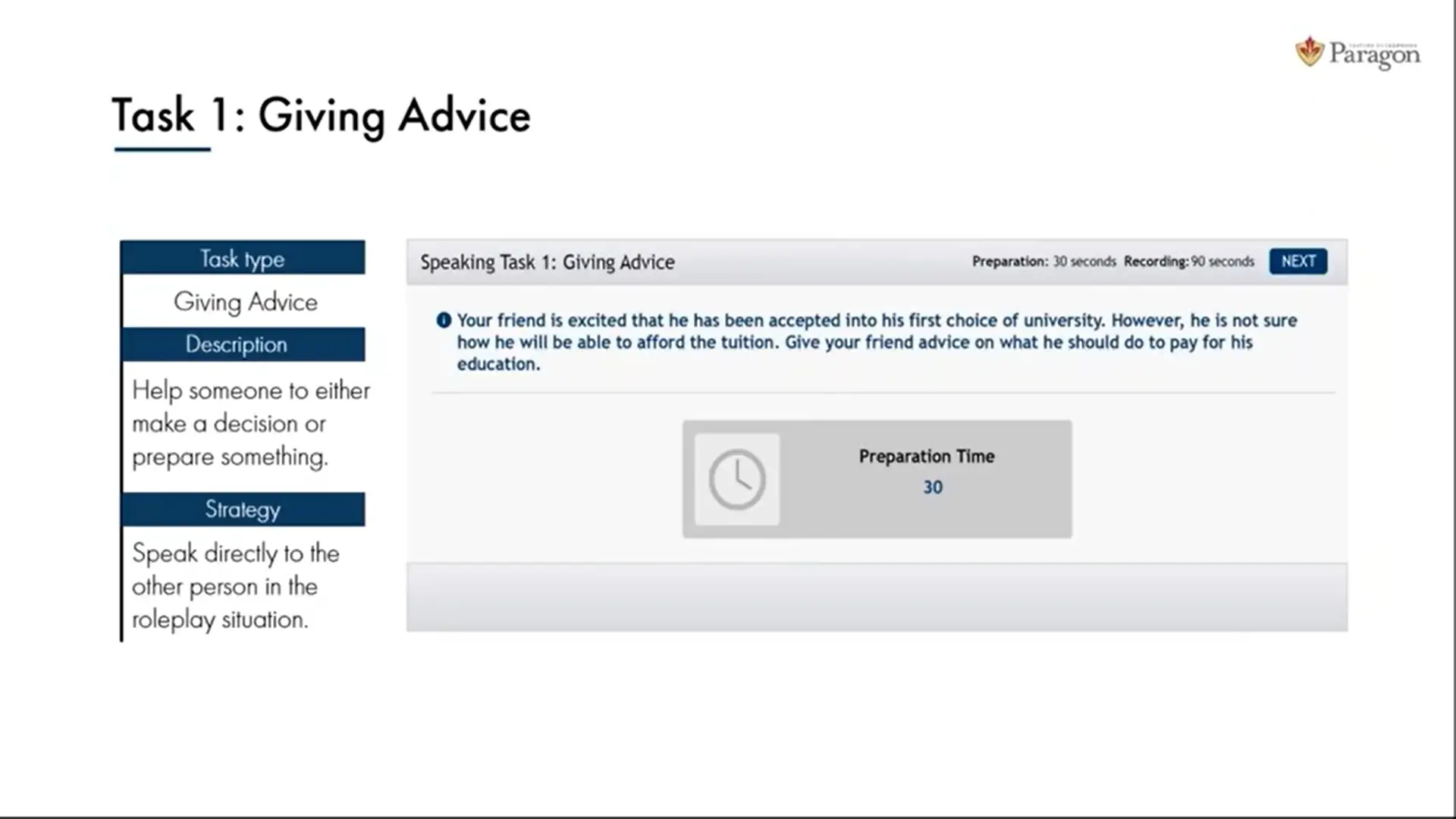 در این تسک، شما 90 ثانیه زمان دارید تا به شخصی در مورد موضوعی خاص نصیحت یا پیشنهاد بدهید.