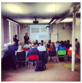 In the picture, a teacher or presenter is standing in front of a group of adults who are sitting on colorful seats arranged in rows, and it looks like the meeting is taking place in an office meeting room. The teacher is using a large screen for the presentation, which seems to be connected to a projector fixed to the ceiling where several lamps and lights can also be seen. While all the adults are paying attention to the presentation, there is a woman standing next to the teacher who might be a manager or possibly an assistant, as she seems to be helping with the presentation. Moreover, the teacher appears confident and well-prepared, and some participants are taking notes whereas others are just listening. In addition, the colorful seats make the room look modern and creative, so overall, the photo shows a typical training or workshop session at work